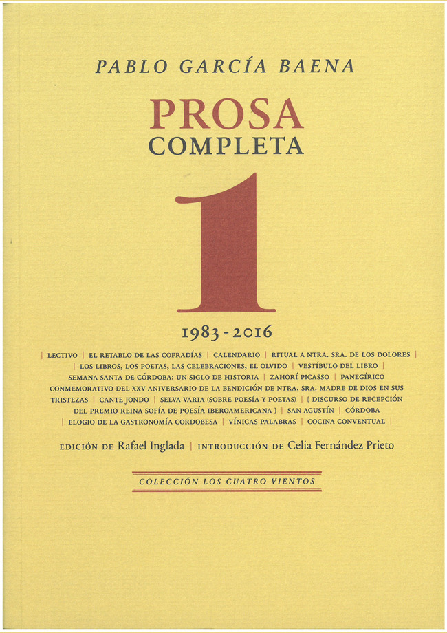 La prosa dispersa de Pablo García Baena (Córdoba, 1921-2018) es la de un poeta a pie de calle, a pie de su propia autobiografía. Textos que el autor rehusó publicar en sus libros mayores, tal vez por considerarlos que pertenecían a su «prehistoria» –como gustaba llamar irónicamente a su creación juvenil–, o porque correspondían a una simple anécdota literaria o a un compromiso amistoso del momento. Amistad sería la palabra adecuada para comprender esa escisión en donde, aun así, perdura y cabe toda Córdoba –la de su infancia y madurez– al paso nocturno de sus tradiciones; toda la ciudad nativa, de cuya historia cultural fue un acérrimo defensor, la de los toreros y la de las tabernas con el cante jondo, con ese «plasticismo necesario para levantar las arriesgadas columnas del grito». Pero también en donde cabe, y estas páginas lo corroboran, todo Cántico, que podríamos esbozar con aquellos versos de Jorge Guillén: «relaciones felices / entre quienes, aún mozos, / se descubrieron gustos, preferencias / en su raíz comunes. / ¡Poesía!». Y también los secretos de su propia palabra poética, en la cual, como el propio autor sentenció, «el poeta no va a salirse de su biografía interior». Todo este universo, que ahora rescata Renacimiento, ha permanecido durante décadas secuestrado por el tiempo, perdido en las olvidadas revistas de la época, en los periódicos que le abrieron las páginas al poeta para que penetrase, clara y firme, su voz, en los catálogos de las efímeras exposiciones, en presentaciones a amigos, en conferencias, en discursos… Un conjunto que no hace sino afianzar aún más, y descubrirnos a su vez, la inmensa figura de un García Baena inédito para muchos. «Lo contenido en este libro –como bien señala Jesús Cabrera a modo de presentación– es el equivalente a las carpetas que se guardan en el estudio del pintor, a los sucesivos dibujos y bocetos, o a los lienzos superpuestos y apoyados en el suelo que, a lo mejor, nadie ha visto en décadas. Es una historia paralela a la pública, tan válida e interesante como aquella, que nos muestra de forma directa y sin artificios la humanidad que hay en todo proceso creativo».